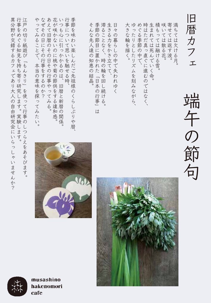 実際の植物を使って古い文献をもとに、「薬玉」をつくってみましょう。この季節にふさわしい「かたち」のもんきりもしましょう。