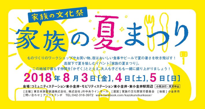 ものづくりのワークショップやお買い物、夜はおいしい食事やビールで夏の暑さを吹き飛ばす!高架下で夏を愉しむイベント「家族の夏まつり」。この地域で暮らす仲間を「かぞく」ととらえ、大人も子どもも一緒に盛り上がりましょう!