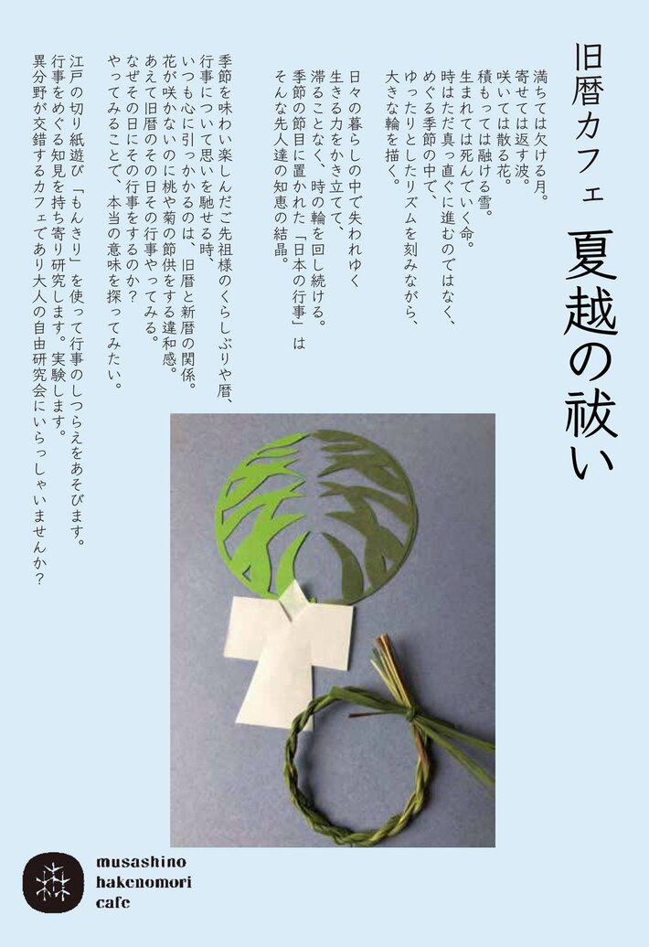 夏も盛りのこの時期にぴったりのもんきりを楽しみ、実際の茅で「茅の輪」も作ってみましょう。そして、なぜ、茅なのか?どうして潜るのか?その秘密に迫ってみましょう。