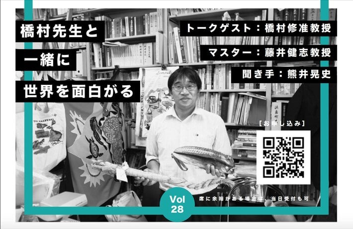 トークゲストは学芸大学の橋村修先生です。先生の研究課題のキーワードは、「フードスケープ、漁業史、シイラ、漁場、駄菓子」。