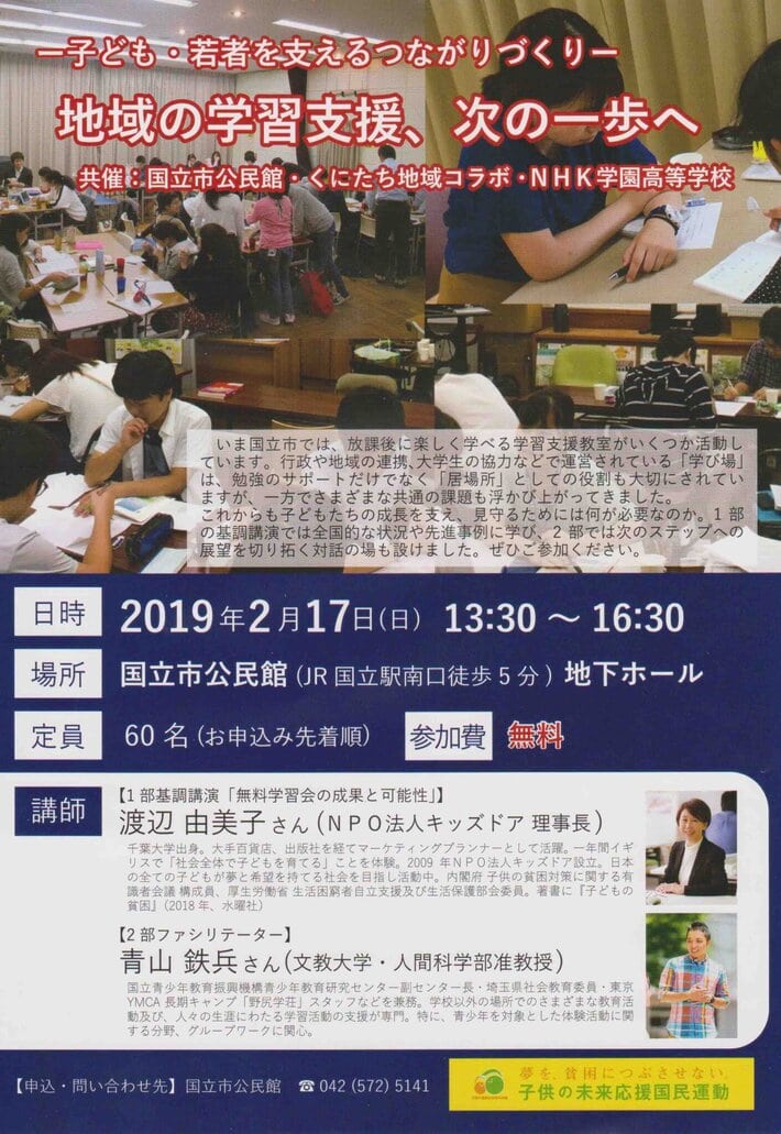 今後も地域で子ども・若者の成長を支える豊かな「学び場」「居場所」をつくっていくために、今後なにが求められるのか。今回は1部では、基調講演に特定非営利活動法人キッズドア理事長の渡辺さんをお招きし、全国的な状況や先進事例から学、2部では次のステップへの展望を切り拓く対話の場を設け、本テーマへの議論を深めていきます。地域の学習支援における次の一歩に興味・関心のある方は、一緒に考えてみませんか。