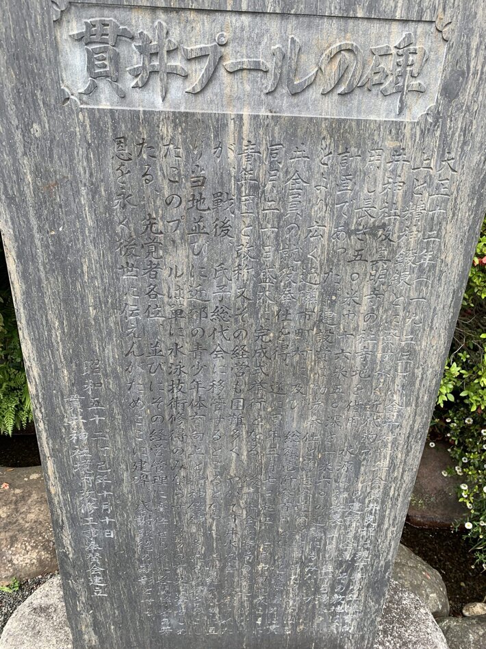 今でも神社の入り口に碑が立っています。碑文によれば大正12年(1923)に作られて、長さ50m、幅16m、深さ1.6mとかなり大きなプール。水源は神社の裏で湧いている湧水を利用していたということのよう。冷たかったのかな?でも「ぬくい」だからそれほど冷たくなかったのかもしれません。