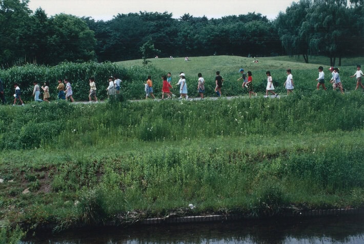 角度や歩いている向きが違うのですが、景色は今とほぼかわりません。手前に野川が流れ、岸には季節の雑草が生い茂り、その向こうの広々としたはらっぱの道を遠足の子どもたちが列を作って楽しげに歩いています。